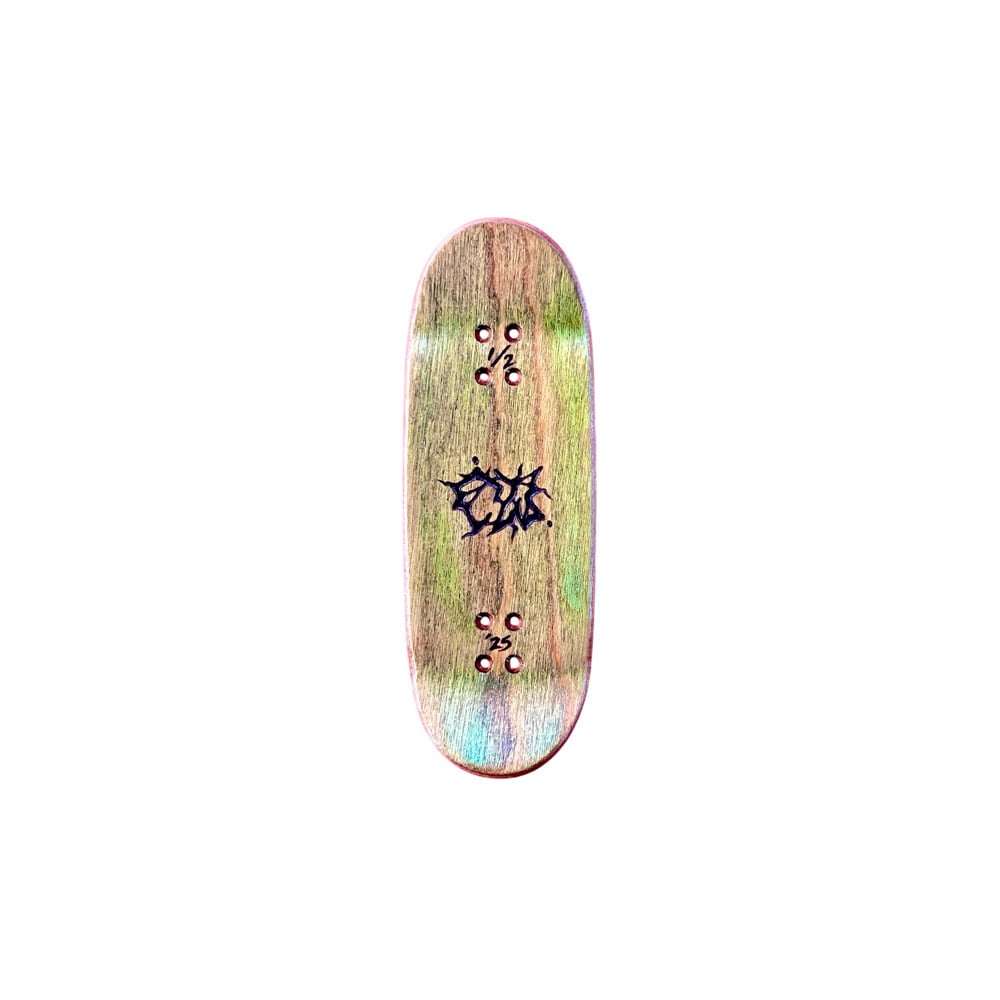 35mm x 97mm Eggsicle “Death Split”. Fully hand cut split ply, with a hand burned top ply. Collins Wood decks currently have a wheelbase of 59mm. Concave 1.5mm, and a kick degree of about 22.5 with an ever so slight raise in the nose. Each deck comes with foam tape, stickers, and good luck charm.